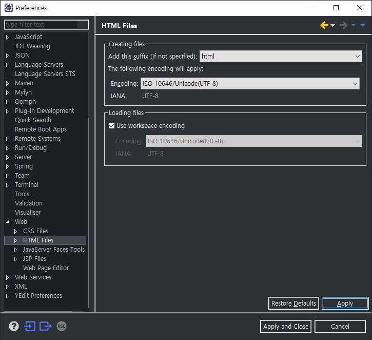 Web – HTML Files- Encoding UTF-8 선택 Apply