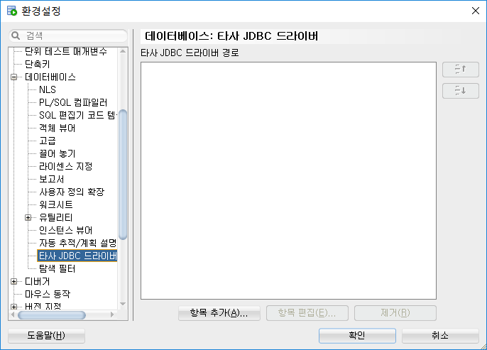 데이터베이스 -> 타사 JDBC 드라이버를 선택하여 MySQL Jar를 항목 추가 버튼을 통해 등록하도록 하자.