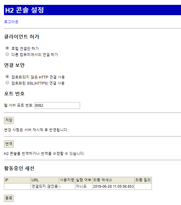 실행하면 다른 DB와 다르게 웹브라우저를 통해 접속이 이루어진다. 처음 실행된 설정 그대로 접속해도 문제가 없다. 사용자 sa는 비밀번호가 없다. 추가적으로 클라이언트 허가, 연결 보안, 포트 번호 등 수정이 필요한 부분은 설정을 통해 변경 가능하다.