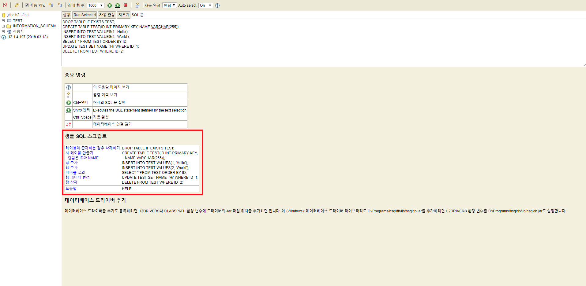 접속 이후 간단한 샘플 SQL 스크립트를 통해 정상작동 여부를 확인 가능하다.