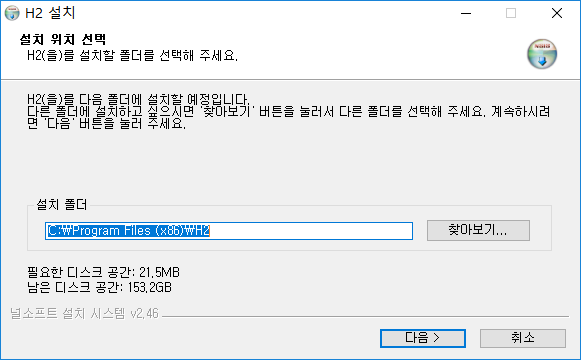 설치 파일을 실행하여 설치를 진행하자. 설치가 완료되면 JAVA_HOME과 같이 H2_HOME를 환경변수 셋팅을 해줘야 한다.