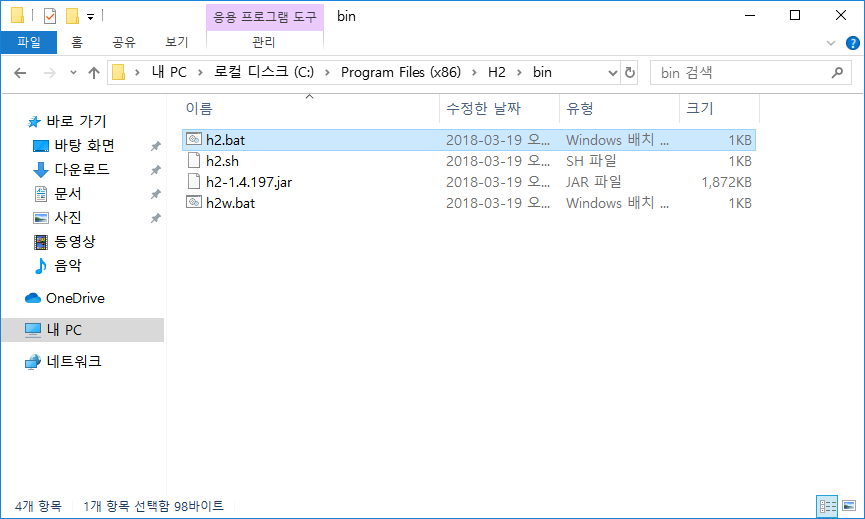 바로가기로 추가된 H2 Console을 실행하는 방법과 실제 설치된 경로에서 실행하는 방법이 있다. 실제 설치 경로에서 실행할 때는 윈도우.bat 맥 또는 리눅스는 .sh 확장가 있는 파일을 실행하면 된다.