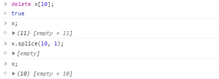결론은 JavaScript 배열은 허물뿐인 배열이다. 실제로는 객체와 동일하게 동작하며, 단지 배열의 길이를 나타낼 수 있는 length 속성이 있기 때문이다. delete로 삭제하면 요소는 사라졌지만 별도로 관리되는 length 값은 변경되지 않는다. 배열 함수 splice을 사용하면 length 값이 같이 변경되는 것이다.