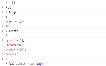 위에서 보면 배열 변수 x를 선언하고 x 배열 10번째 요소에 123 값을 추가하였다. 그 후 x 배열의 length 값이 0에서 11로 바뀌는 것을 확인할 수 있다. 배열의 길이는 11개이지만 x[0] ~ x[9] 요소의 값은 'undefined' 이므로 메모리는 1개의 요소만 할당된다.