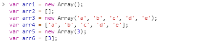 arr1, arr2는 빈 배열을 선언한 것이고 arr3, arr4는 배열을 선언과 동시에 인자를 할당한 모습이다. 주목해야 할 점은 arr5, arr6 배열 객체이다. arr5는 인자가 하나 있는 배열 선언이 아니고 길이가 5인 배열을 선언한 것이다. 하지만 arr6은 인자가 하나인 배열이다.