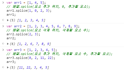 배열의 임의 위치 요소를 제거하거나 추가할 수 있는 함수이다. push, pop, shift, unshift 함수와 동일한 기능이 가능하며 차이점은 splice는 제거된 배열 요소가 반환된다.
