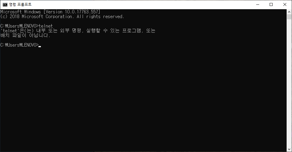telnet 적용이 완료 되었으면 다시 한번 cmd 창에서 명령어를 확인해보자. 이렇듯 telnet 활성화는 생각보다 간단하다.