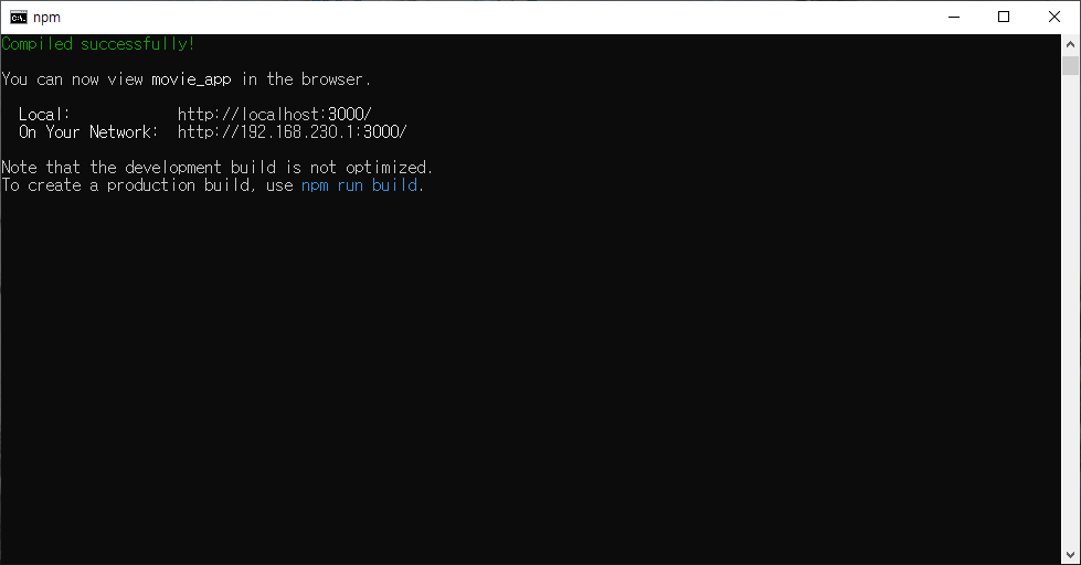 개발서버를 시작하면 컴파일이 성공적으로 완료되었다는 메시지를 볼 수 있다.