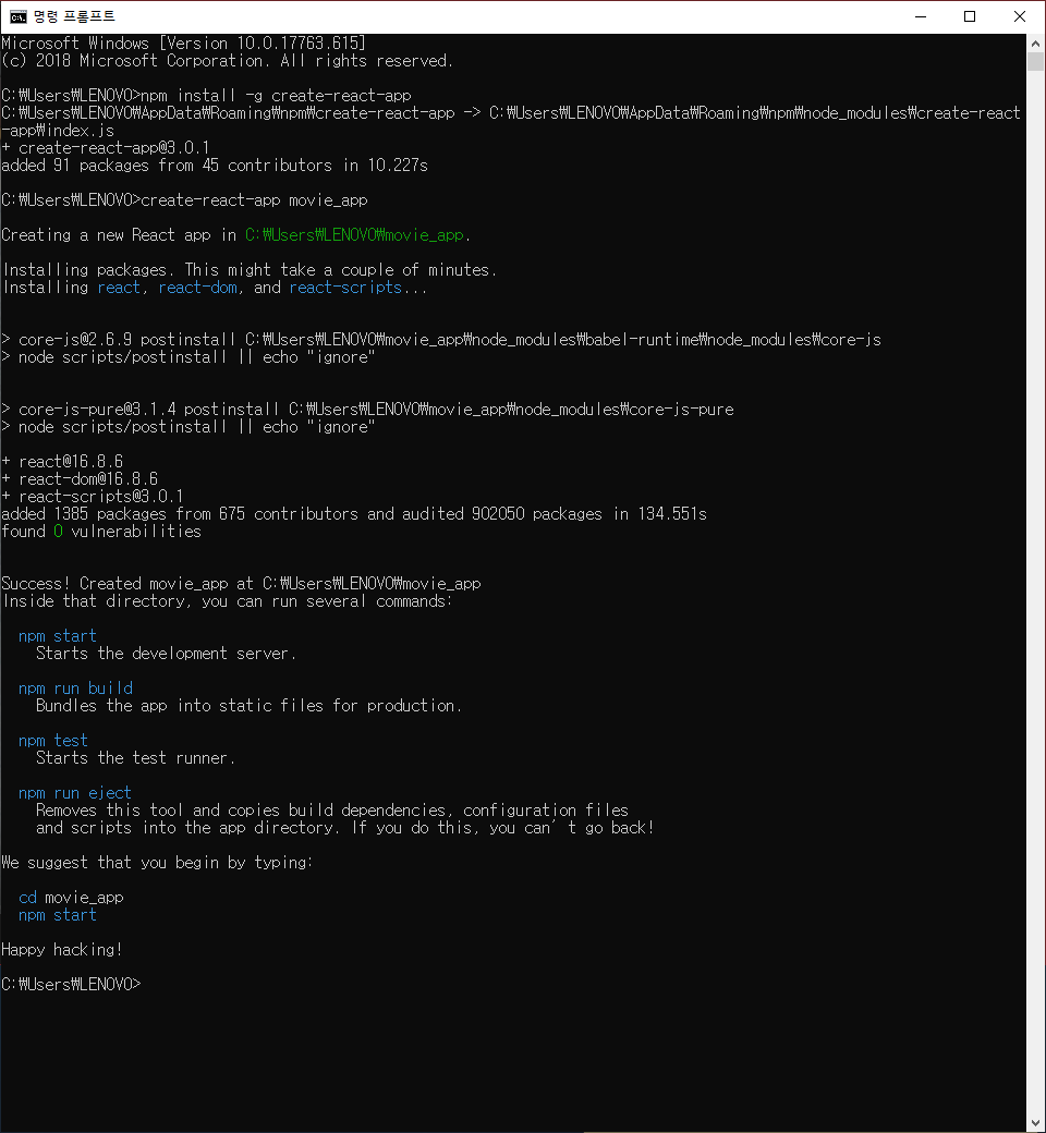 설치가 완료되면 그다음 리액트 앱을 만들면 된다. movie_app 이란 이름으로 해보자.