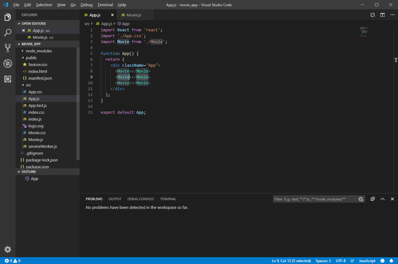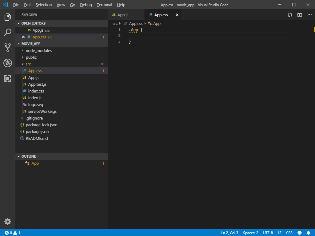 이제 제대로 된 컴포넌트를 만들어 보자. App.js에 모든 영화 내용, 정보를 담을 예정이지만 현재는 비어있다. 새로운 컴포넌트를 만들고, 이름은 Movie.js, Movie.css로 하자. App.js를 참조해서 Movie.js를 만들어 보자.