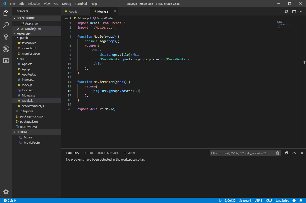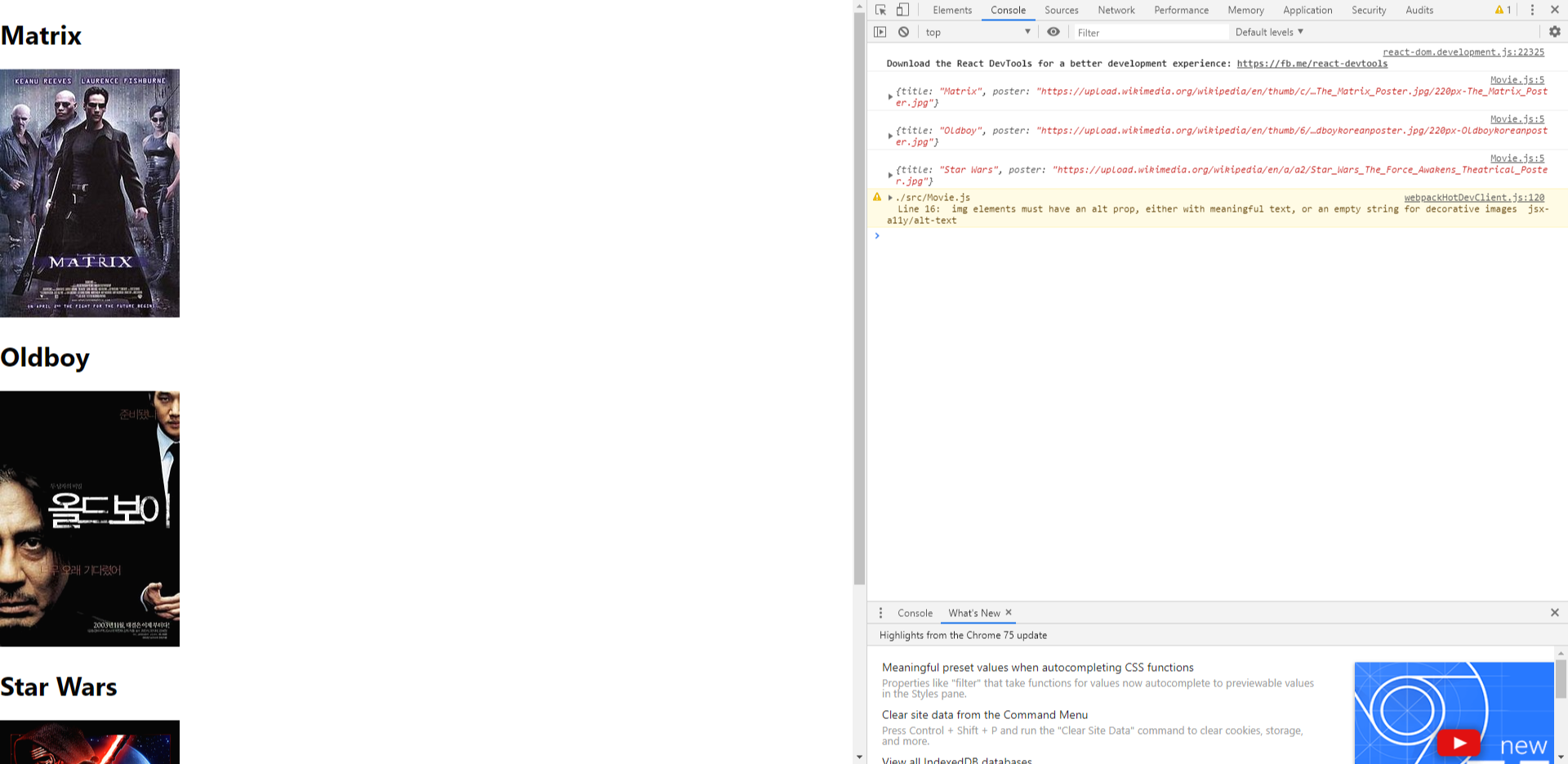 App.js에서 const를 사용하여 movies 목록을 정의하고 Movie 컴포넌트에 title이라는 데이터를 전달한다. 그다음 Movie.js에서 console.log를 찍어보자. 전달받은 인자로는 props이다. props 오브젝트를 통해 접근하고 데이터를 표출할 수 있다. Movie 컴포넌트에 title이 있고, Movie.js에서 title을 props로 불러온다. Movice 컴포넌트는 title이라는 요소를 가지고 있기 때문이다.