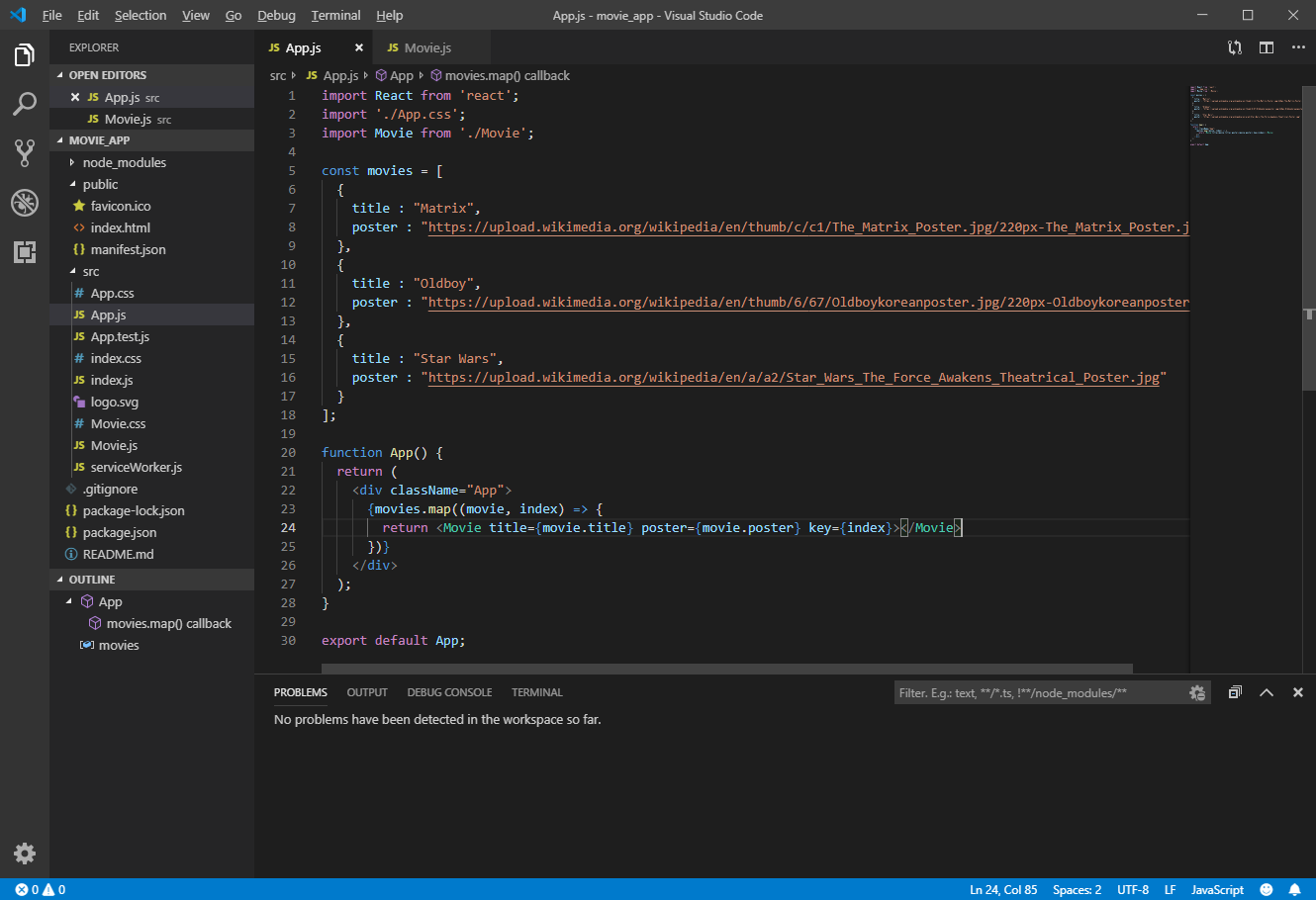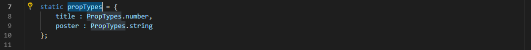 우선 상단에 import PropTypes from 'prop-types'; 선언한다. 그다음 Movie 컴포넌트에 static propTypes을 작성한다. 타이틀, 포스터 모두 string 타입을 검사한다.