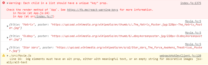 리액트는 엘리먼트가 많은 경우 유니크한 key를 지정해줘야 한다. 아래와 같이 코드 변경을 통해 warring을 없애보자.