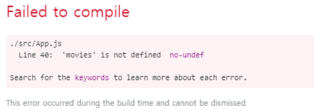 영화 리스트를 state 안으로 옮기면 위와 같은 컴파일 에러가 나타난다. 'movies'는 정의되지 않았다는 메시지이다. greeting과 마찬가지로 this.state로 접근하면 된다.