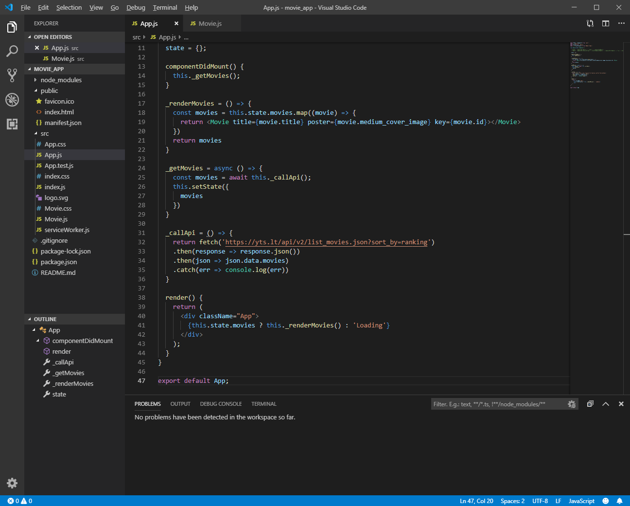 fetch를 _callApi함수로 변경하였고 _getMovies 함수를 만들어 componentDidMount()에서 사용하였다. _getMovies는 async이며 _callApi 작업이 완료되고 return 하기를 기다린다는 뜻으로 await를 사용하였다. _callApi는 영화 리스트를 JSON 포멧으로 반환하였다.