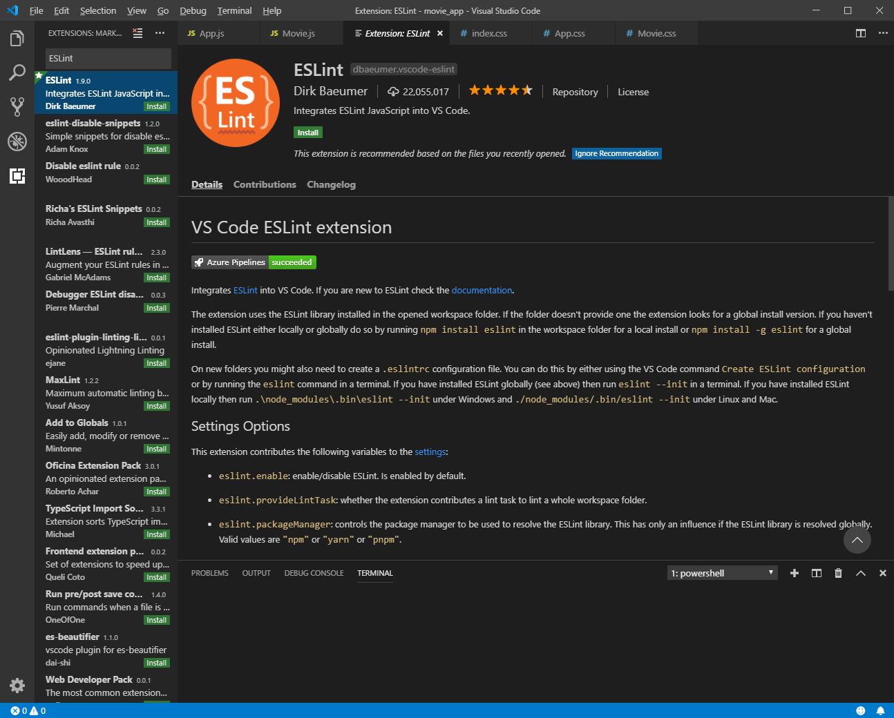 문법 검사 및 자바스크립트 코딩 스타일을 위해서 ESLint라는 도구를 사용한다. 사전에 정의된 코딩 스타일과 맞지 않으면 경과나 에러가 나타나 질 좋은 코드를 작성할 수 있게 도와준다.