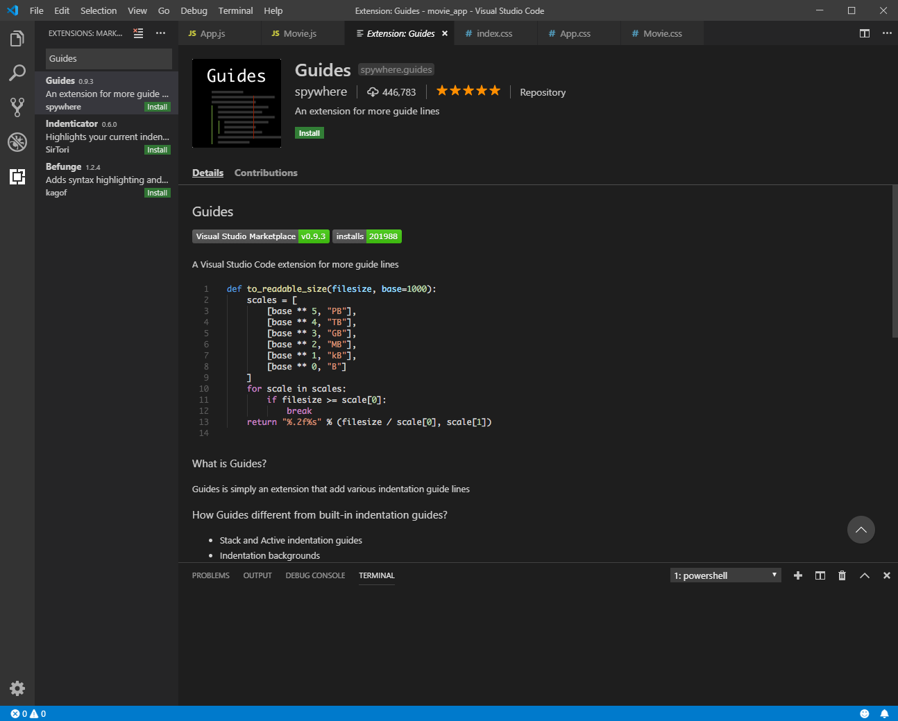 코드 작성에 안내선을 표시해 준다. 코드의 시작과 끝을 안내선을 통해 한번에 파악하기 쉽고 심플하고 정리된 코드를 얻을 수 있다.