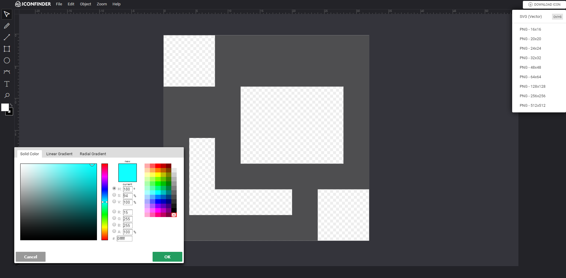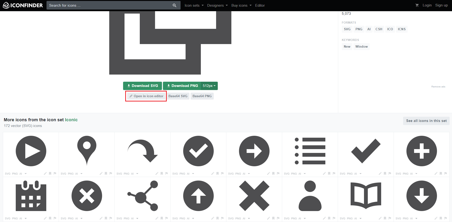 Open in icon editor의 경우에는 아이콘 편집이 가능하다. Pencel, Line, Square, Rect, Elipse, Circle, Path, Text, Zoom, Color 등을 제공한다. 우측 상단의 Download Icon에서는 크기별로 다운로드를 제공한다.