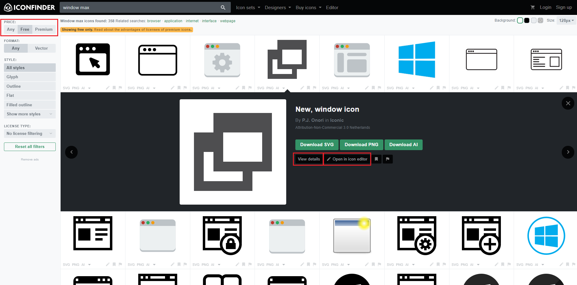 PRICE에서 Free를 선택하여 원하면 아이콘을 고르면 된다. 아이콘 클릭 시 View details은 아이콘 상제 정보와 함께 아이콘 제공자의 추가적인 아이콘들이 나열되어 나타난다. 같은 테마의 이미지를 추가적으로 찾기 쉽다.