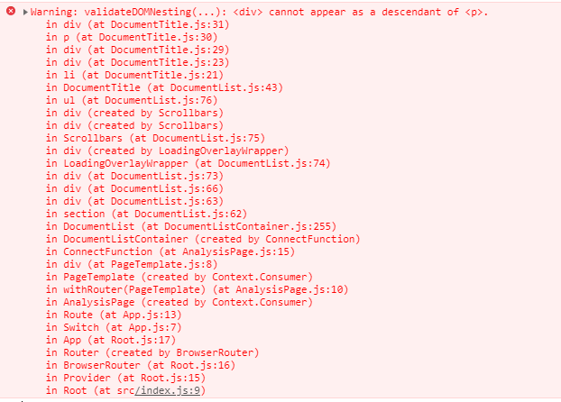 React 개발 중에 나타난 Warning이다. Warning이라 큰 문제는 없지만 console에 자꾸 나타나는 것은 언젠가는 바로 잡아야 한다. DocumentTitle.js 31 라인 div와 DocumentTitle.js 30 라인 p 태그의 문제라고 친절히 알려준다.