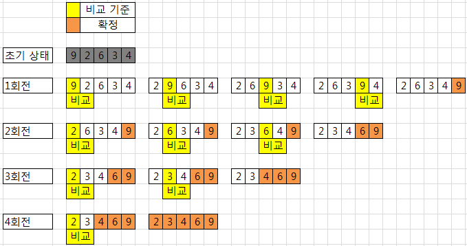 1회전을 수행하고 나면 가장 큰 자료가 맨 뒤로 이동하므로 2회전에서는 맨 끝에 있는 자료는 정렬에서 제외되고, 2회전을 수행하고 나면 끝에서 2번째 자료는 정렬에서 제외된다. 이런 식으로 정렬을 1회전 수행할 때마다 정렬에서 제외되는 자료가 하나씩 늘어난다.