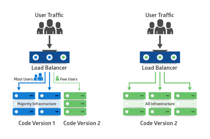 구 버전을 블루, 신 버전을 그린 이라고 해서 붙여진 이름이다. 신 버전을 배포하고 일제히 전환하여 모든 연결을 신 버전을 바라보게 하는 전략이다. 구 버전, 신 버전 서버를 동시에 나란히 구성하여 배포 시점에 트래픽이 일제히 전환된다. 빠른 롤백이 가능하고, 운영환경에 영향을 주지 않고 실제 서비스 환경으로 신 버전 테스트가 가능하다. 단 이런 구성은 시스템 자원이 두배로 필요하여 비용이 더 많이 발생한다.