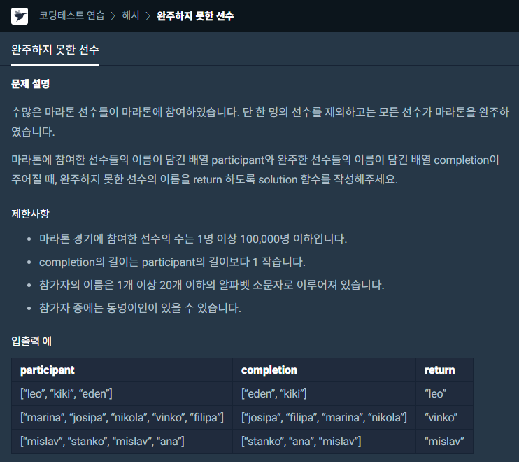 완주하지 못한 선수를 찾는 문제는 입출력 예를 보면 간단히 구현 가능하다. 완주하지 못한 사람은 1명뿐이고 partitiparticipant 배열에서 completion를 제외하면 쉽게 답이 나오지만, 미리 정렬을 해야 하는 함정이 있다. 정렬이 선행되지 않고 2중 for문으로만 해결하려다 보면 테스트는 통과되지만 효율성(성능) 채점에서 실패가 발생한다.