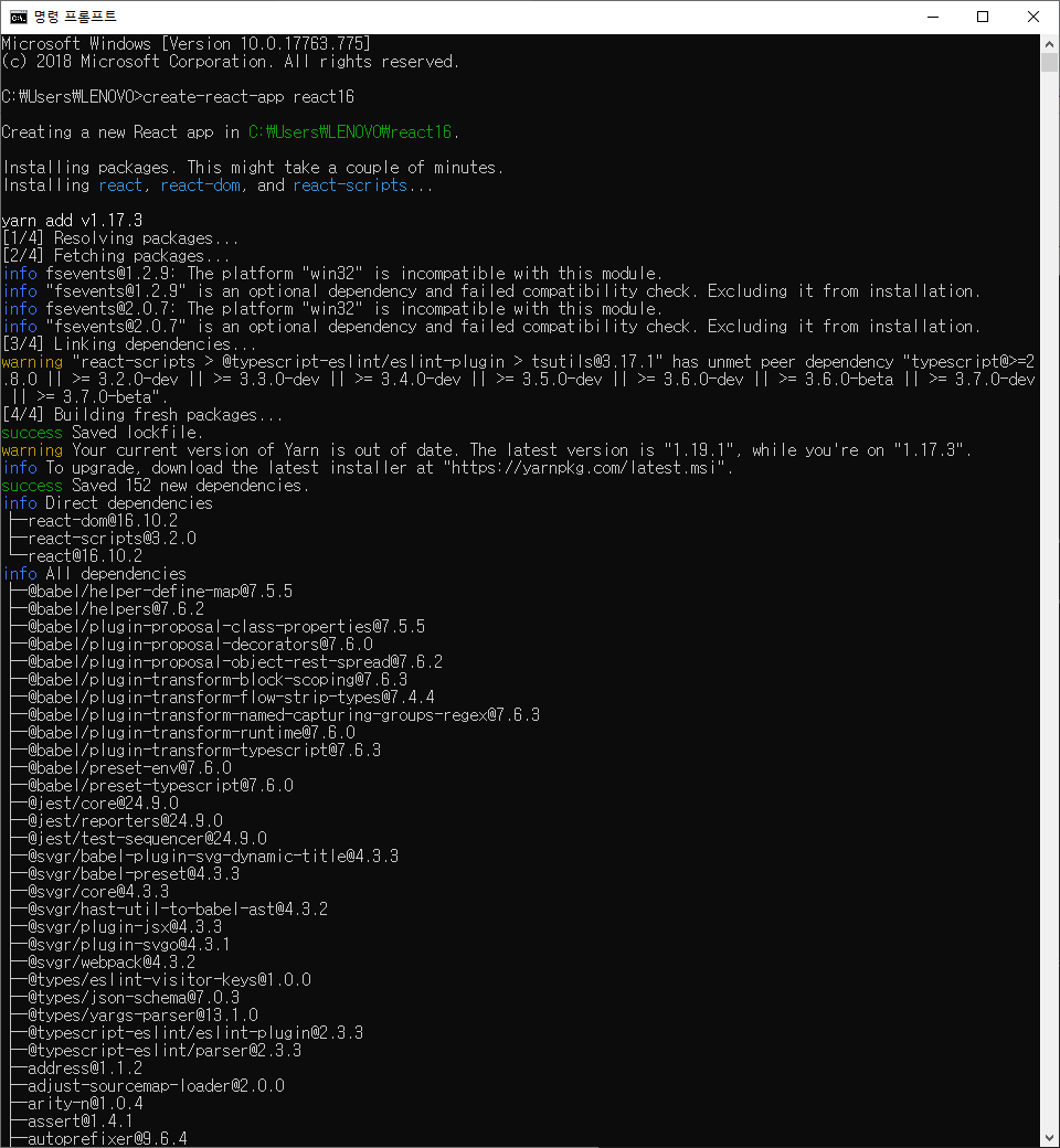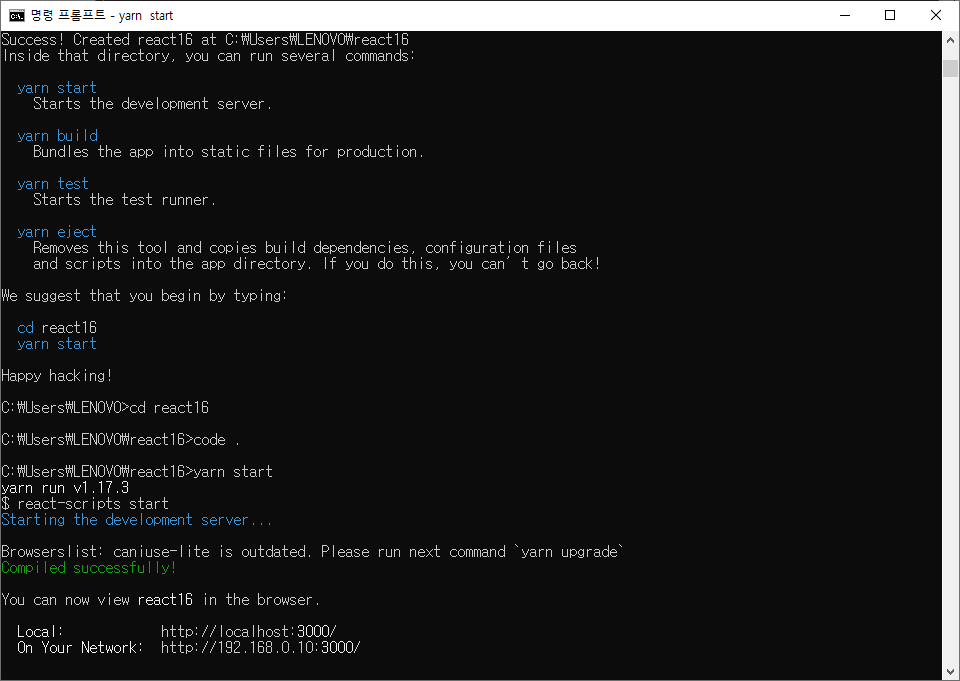 리액트 15 버전이 나온 지(2016년 4월 7일) 1.5년 만(2017년 9월 26일)에 리액트 16 버전이 릴리즈 되었다. 리액트 16에서 놓쳤던 부분에 대해서 알아보도록 하자. 우선 create-react-app 명령어도 프로젝트를 생성, code . 명령어로 VSC를 실행, yarn start 명령어로 서버를 구동해 보자.