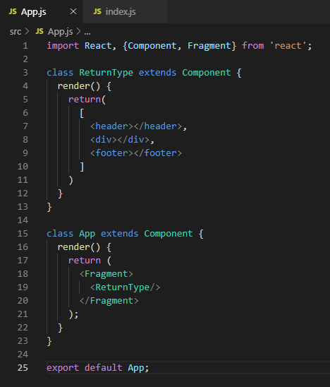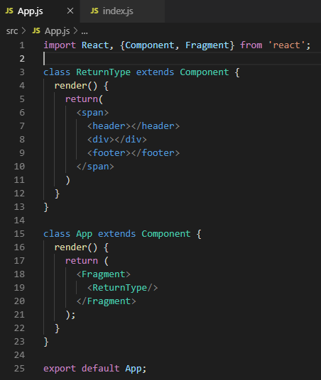 하나가 아닌 두 개 이상의 리턴 하고 싶어도 이전의 리액트에서는 이렇게 작업을 하지 못했다. array로 감싸거나 span태그를 이용하여 다시 하나의 엘리먼트에 감싸줘야 했다. 불필요한 코드가 늘어났고 상당히 불편하였다.