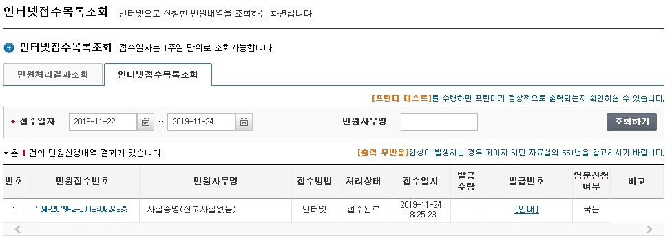 민원처리경과조회에서 확인 할 수 있다.