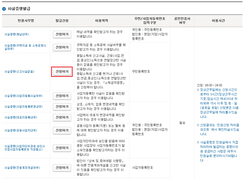 사실증명(신고사실 없음) 클릭을 하면 된다.
