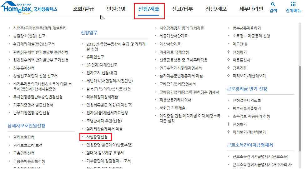 "신청/제출" 메뉴에서 "사실증명신청"을 클릭하자.