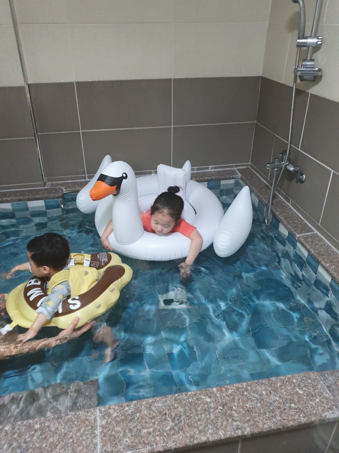 저녁식사를 먹고 입실시간에 맞춰 도착하였다. 숙박업소는 "수안보 패밀리스파텔"이다. 수안보에 몇 개의 가족탕이 있는 숙박업소가 있다. 여러 업체를 비교하여 결정하였다. 우리 가족은 4인 가족이라 "한실 대중탕형" 객실이다. 온돌이라 따듯함은 물로 아이들이 침대에서 떨어질 일도 없다. 입실하자마자 해야 할 일은 물 받기이다. 탕이 매우 커서 오래 걸리거 같지만 생각보다 금방 받는다. 온천수는 따로 조작이 가능하다. 온천수가 53.C라 뜨겁긴 하지만 순수 온천수로 놀려면 온천수를 받아 적정온도로 식히는 방법이 좋다. 냉수는 온천수가 아니다.