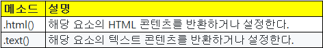 다음 메서드를 사용하면 기존 요소의 내부에 새로운 요소나 콘텐츠를 반환하거나 설정할 수 있다.