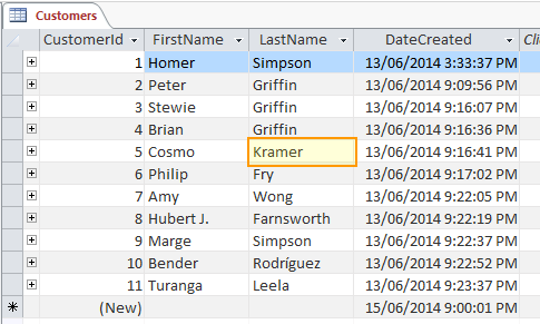 레코드의 예로는 "고객"테이블의 단일 행이 있다. 예를 들어이 행에는 고객의 이름과 성이 포함될 수 있다. 따라서 레코드에는 고객의 이름과 성이 포함된다. 필요한 경우 ID 필드, 레코드가 생성된 날짜 등과 같은 다른 필드도 포함될 수 있다.