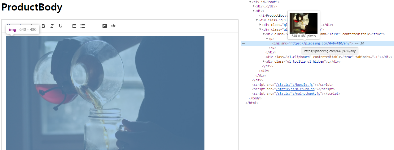 React로 QuillEditor를 컴포넌트로 구성하여 image url과 api callback 형식이다.