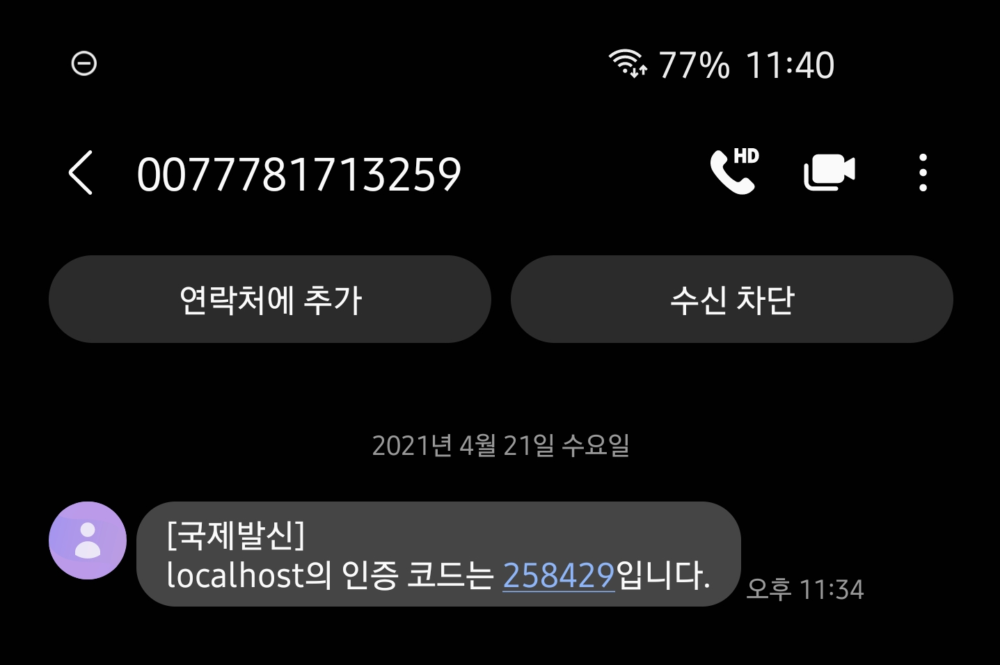 인증 요청을 하면 입력된 전화번호로 Firebase에 등록된 도메인을 기반으로 코드가 전송된다. 이후 인증 확인을 누르면 인증이 완료된다.