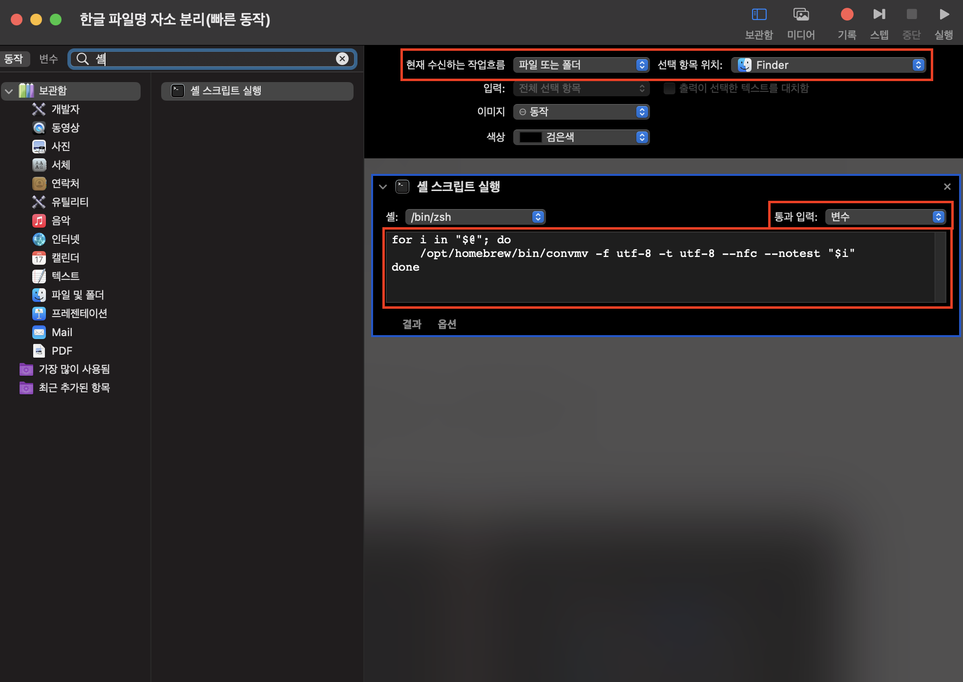 convmv 설치 후 위 명령어로 지정된 파일만 해결이 된다. 파인터에서 우클릭 형태로 쉽고 빠르게 작업하실 분은 아래 설명하는 Automator를 생성하자.