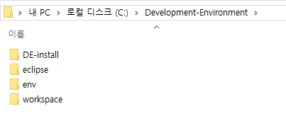 필자는 Development-Environment라는 폴더를 루트로 하여 DE-install, eclipse, env, workspace를 구성하였다.