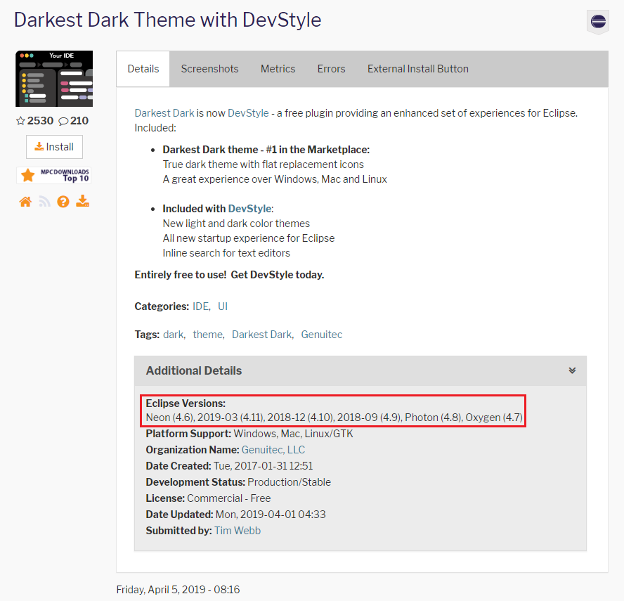 여기서 주목할 점은 적용 가능한 버전이다. 2019-03, 2018-12, Photon, Oxygen, Neon 버전이 가능하다.