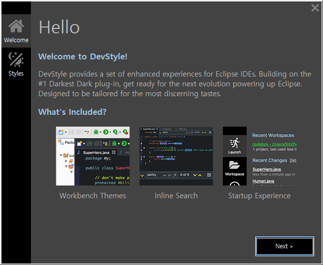 8. 테마 적용이 완료된 이후 Window -> Preferences -> DevStyle -> Color Themes에서 언제든지 다시 변경할 수 있다.