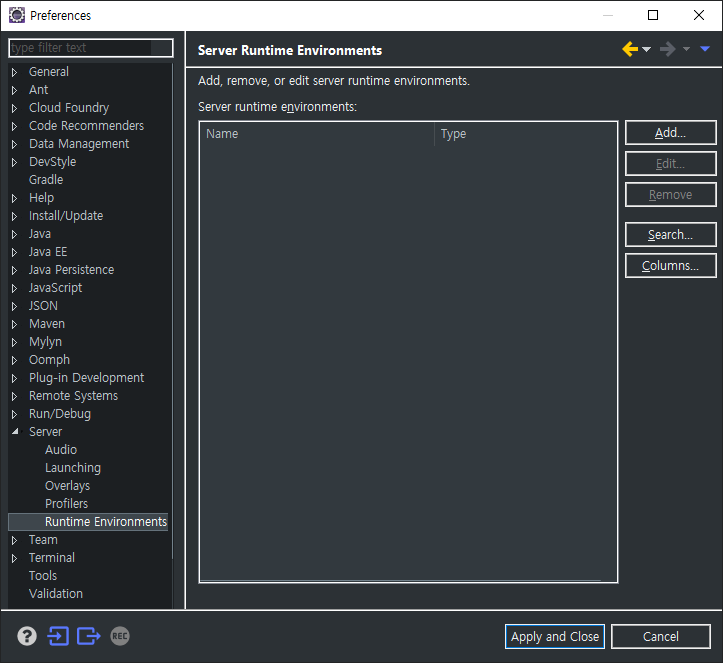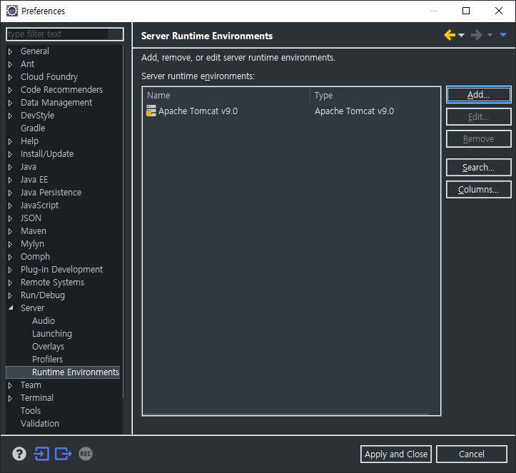 Window -> Preferences -> Server -> Runtime Environments를 선택한다.