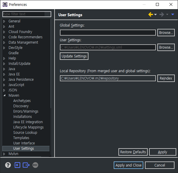 어디에서 같은 개발환경을 구성하려면 메이븐 Repository를 변경해야 한다. 기본 설정 값은 Default: ${user.home}/.m2/repository 이다.