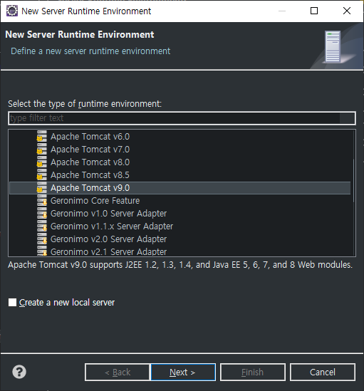 Add 버튼을 통해 설정할 톰캣 버전을 선택한다. (Apache Tomcat v9.0을 선택)