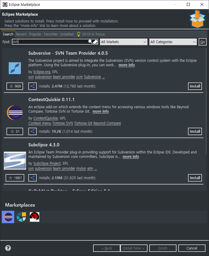 Help -> Marketplace를 선택하여 svn을 검색하여 SVN Team Provider 4.5를 install 한다.