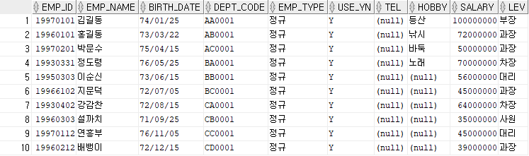 WHERE EMP_NAME IN ('홍길동', '김길동');