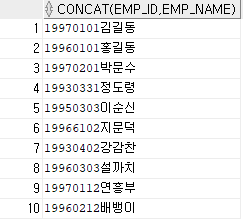 두 개 이상의 문자열을 연결하여 하나의 문자열을 만들어낼 때 사용한다. 합성 연산자를 사용하거나 CONCAT 함수를 사용한다.