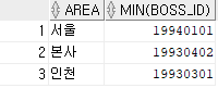 -- TDEPT 테이블에서 지역 별로 최소 BOSS_ID을 조회하라.