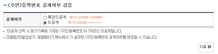 소재지, 주민번호 공개, 발급 통수 등을 확인하고 발급을 클릭하면