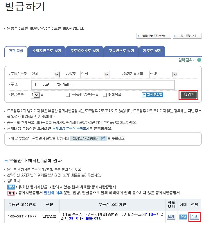 수수료는 열람하기(700원), 발급하기(1000원)이다.